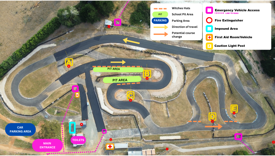 Facilities: Approximately 750m – 800m track closed from vehicle traffic, toilets, drinking water, and space to erect pop-up marquees.