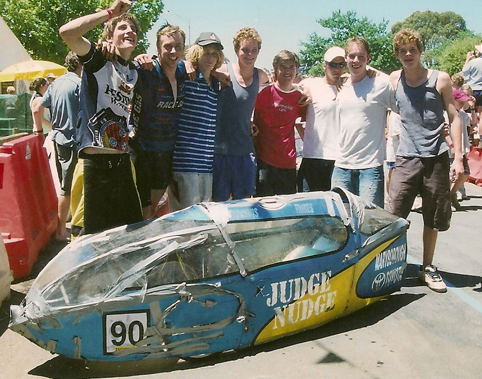 He and his team mates somehow shoehorned themselves into a incredibly tight-fitting ‘Judge Nudge’, a trike well before it’s time that James and his team constructed in his final year of school at St Pat’s College. That trike was fast. I mean seriously fast. Although by the amount of gaffa used at race’s end, maybe not so great at ‘judging’ nudges after all?