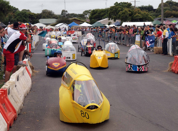 The Human Powered 24 hour race involves the racing of 3 or 4 wheeled recumbent vehicles around a 1.4km street circuit in Wonthaggi (view Grand Prix track). The race involves teams of 8 people and is a test of endurance for the vehicles and the competitors.