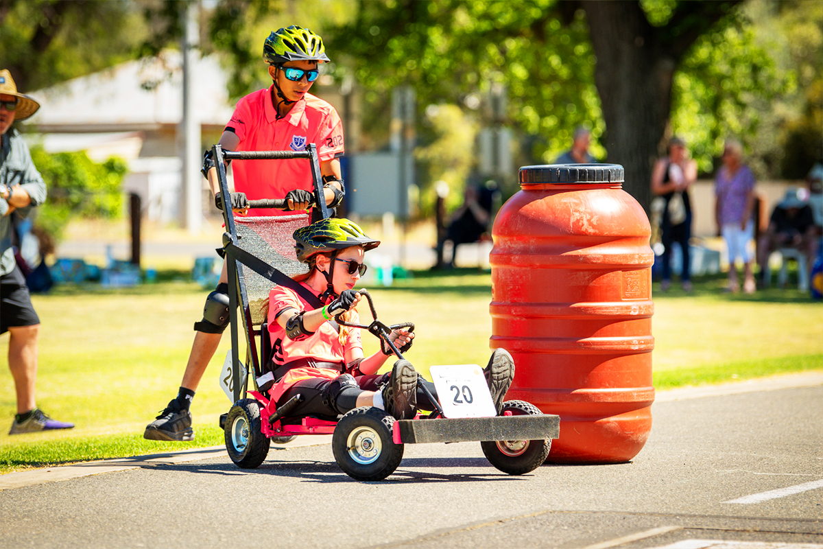 The machines used to compete are based on the humble billy cart, and are pushed energetically through an obstacle course, sprint and circuit events at Maryborough in November.